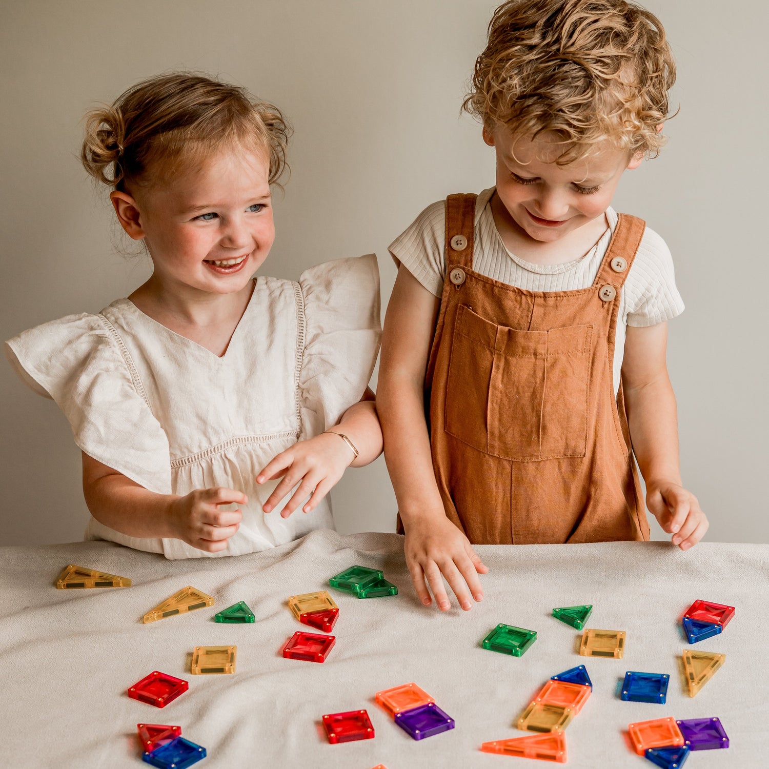 Kinderen bouwen zelf magnetische kastelen, torens en fantasiewerelden. Deze magnetische tegels plakken stevig aan elkaar en stimuleren zelfstandig spelen.
